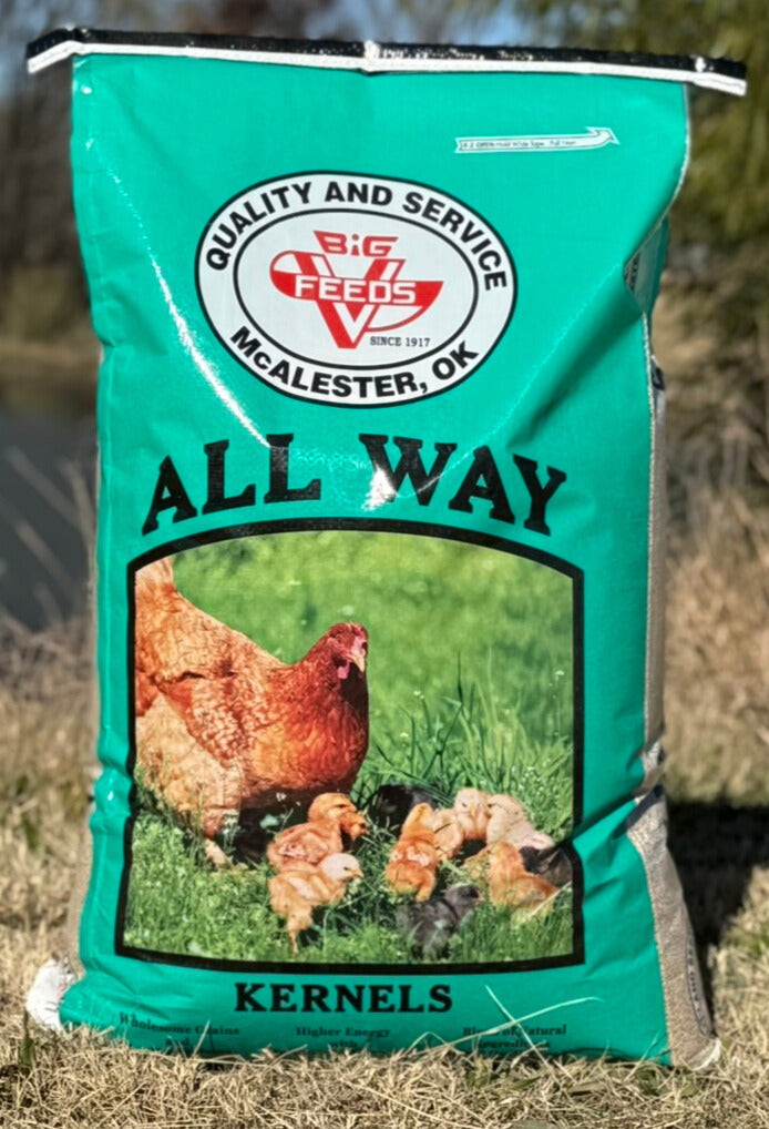 Start feeding this feed as the sole ration to free-range and confined chickens, geese and ducks until laying age (up to 18 to 20 weeks). As an option, feed free-choice oyster shell and grit. For laying flock, switch to Big V Laying Feed. Always provide a constant supply of fresh, clean water and shelter. A feeding program is only as effective as the management practices. Results may vary depending upon feed intake, environmental conditions and the quality of management practices.