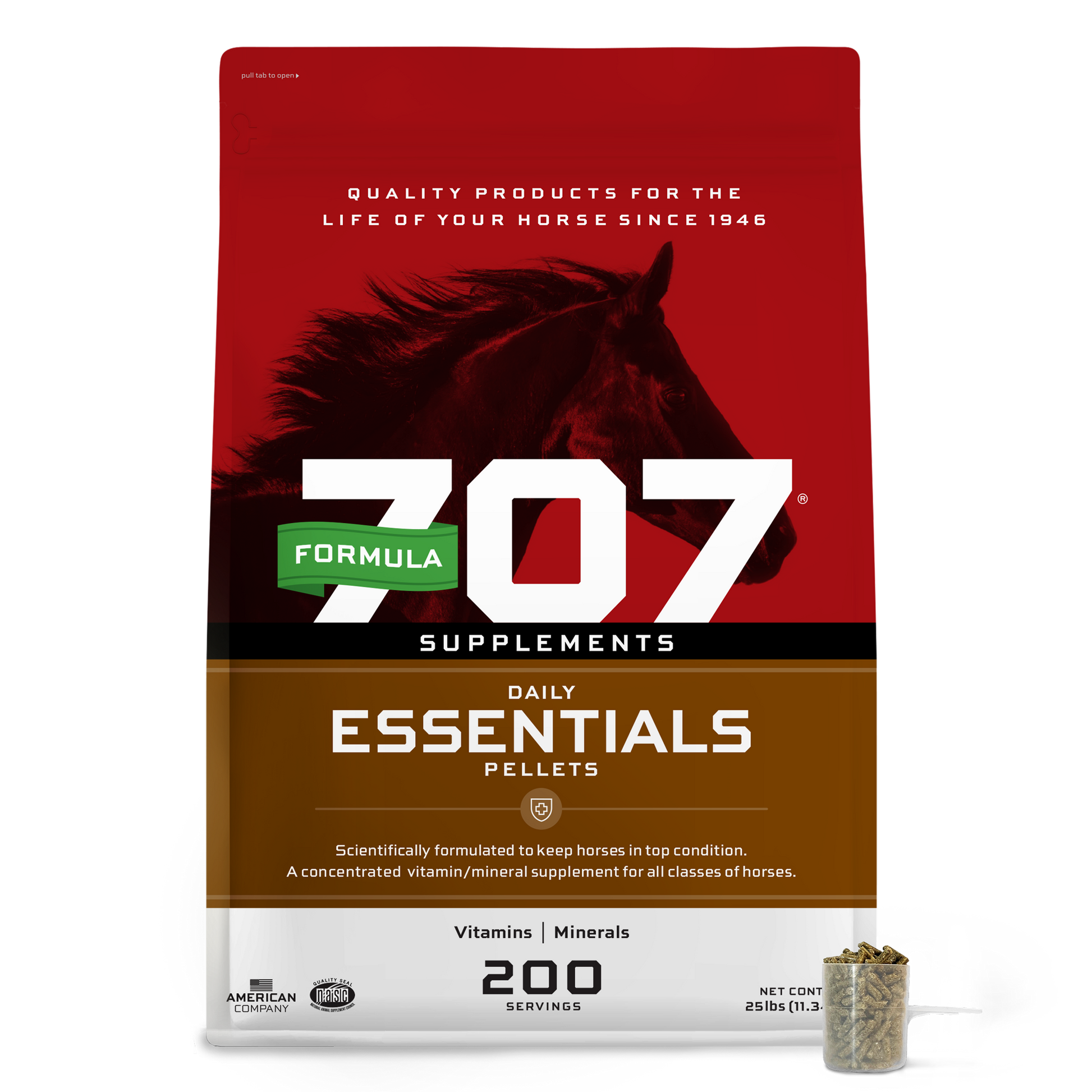 Formula 707 Daily Essentials is widely regarded as one of the best daily equine vitamin and mineral supplements available. Developed through years of extensive testing on yearlings, the results demonstrated that horses supplemented with the correct balance of nutrients exhibited significantly improved growth compared to those fed only grain. Horses receiving Formula 707 Daily Essentials were also noted for their enhanced bloom, alertness, clear eyes, clean noses, and overall superior condition and appearance. Containing every essential vitamin and mineral known to be necessary for equine health, Formula 707 Daily Essentials ensures that horses stay sound and healthy.