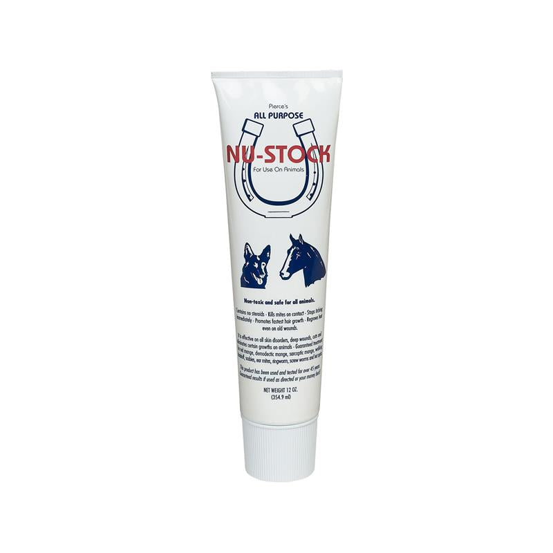 Pierce's All-Purpose Nu-Stock is an effective treatment for most skin disorders and skin-related ailments. Use Nu-Stock to speed the healing of cuts, bruises, burns, swelling and hair loss. Nu-Stock eliminates certain types of growths on animals and is effective against ear mites.