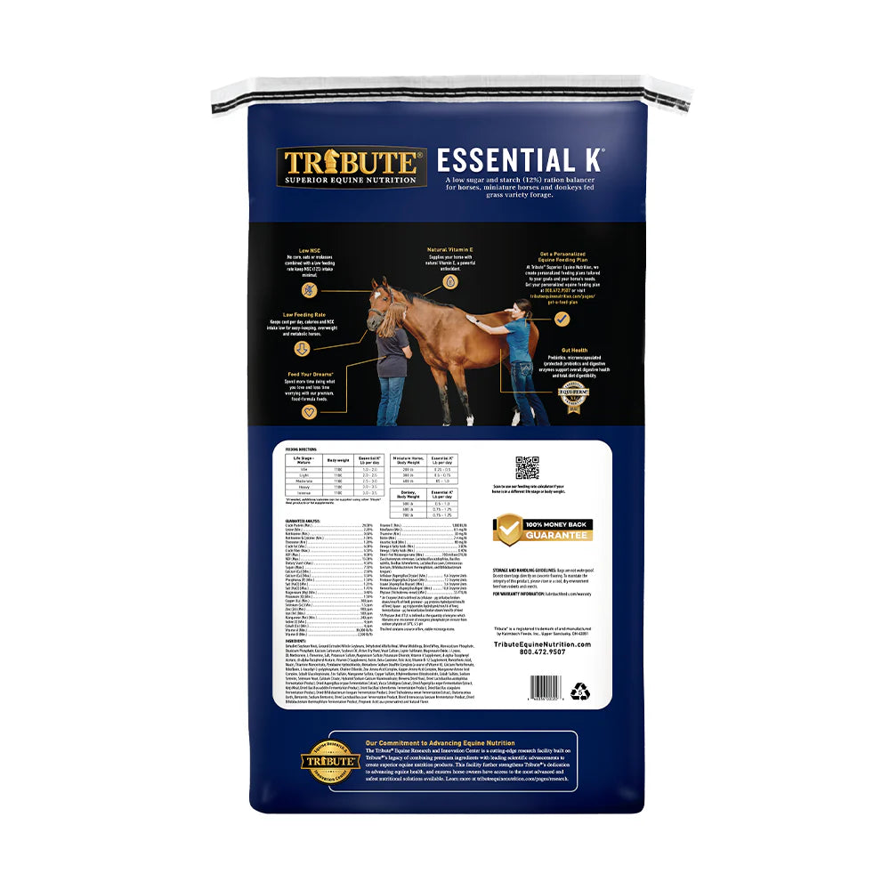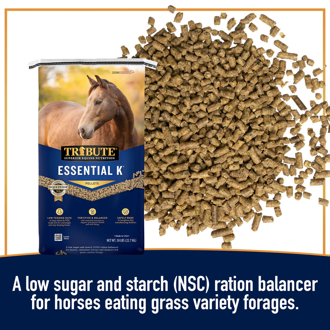 Essential K® is a low NSC ration balancer for any horse needing a low-calorie diet, or boost of essential nutrients, and is balanced for horses eating grass-based forage. Now with an even higher level of pre- and probiotics! Essential K® is also now 100% molasses and flax-free.