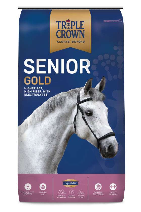 Developed for active, older horses, Triple Crown Senior Gold features a beet pulp-based formula with higher fat, an expanded amino acid profile and gastric buffering, which is ideal for performance horses or those under stress. IDEAL FOR: Mature horses, hard keepers and those prone to gastric ulcers and PSSM